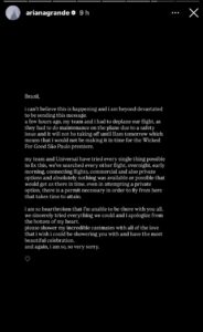 Estou arrasada por não conseguir chegar a tempo”, escreveu Ariana em seus stories no Instagram. Segundo a cantora, o avião precisou passar por manutenção de emergência e só poderia decolar novamente no dia seguinte, tarde demais para chegar à atriz chegar. Ari contou que ela e a equipe tentaram literalmente todas as opções possíveis: voos noturnos, comerciais, com conexão, privados… mas nada deu certo. “Minha equipe e a Universal tentaram tudo. Procuramos todas as alternativas, mas absolutamente nada estava disponível ou viável”, explicou.